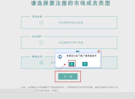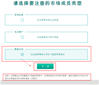 選擇售電公司類型,下載信用承諾書。注冊售電公司前需要先下載信用承諾書,仔細(xì)閱讀后打印并簽字蓋章,最后掃描成PDF格式文件,提交注冊信息時(shí)作為附件信息一并提交。