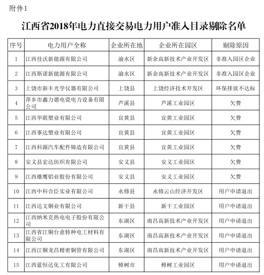 附件:1.江西省2018 年電力直接交易電力用戶準入目錄剔除名單
