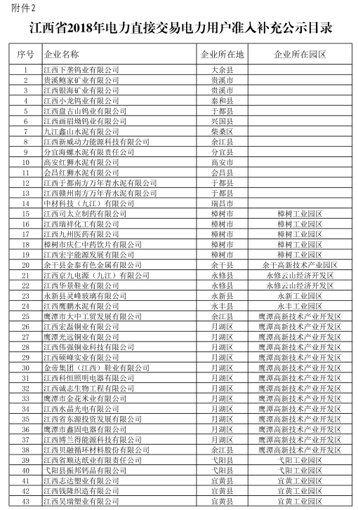 2.江西省2018 年電力直接交易電力用戶準入補充公示目錄