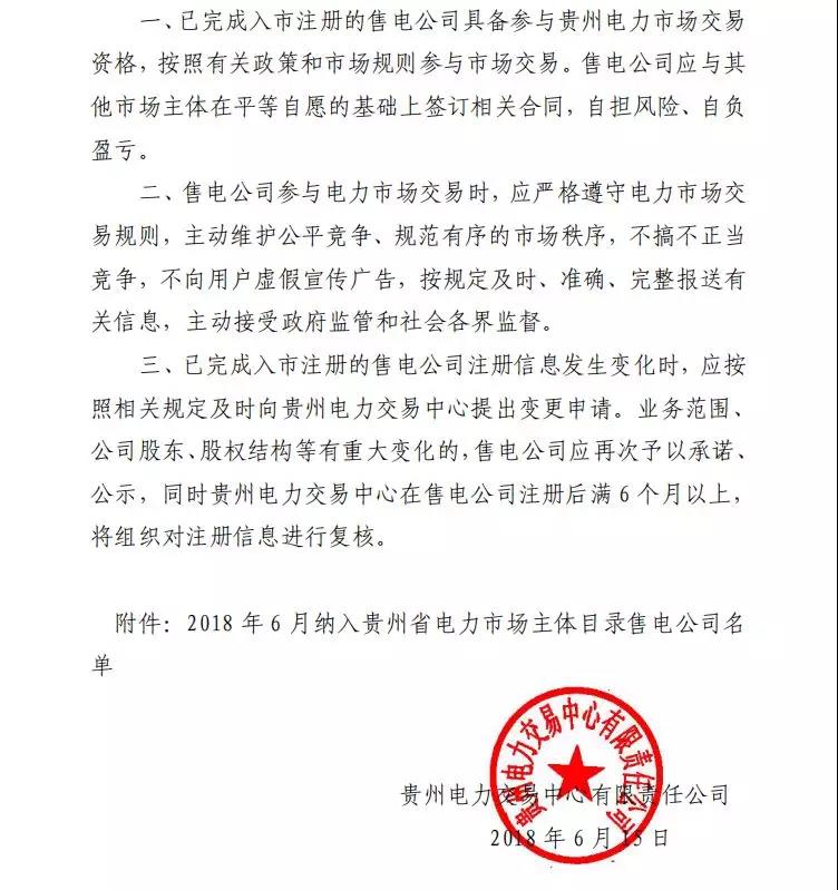 關(guān)于公布 2018 年6月納入貴州省電力市場(chǎng)主體目錄售電公司名單的通知