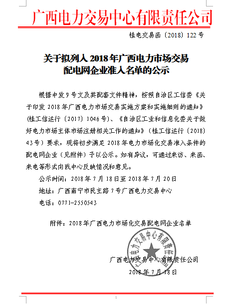 廣西公示擬列入2018年廣西電力市場交易配電網(wǎng)企業(yè)準入名單的1家企業(yè)