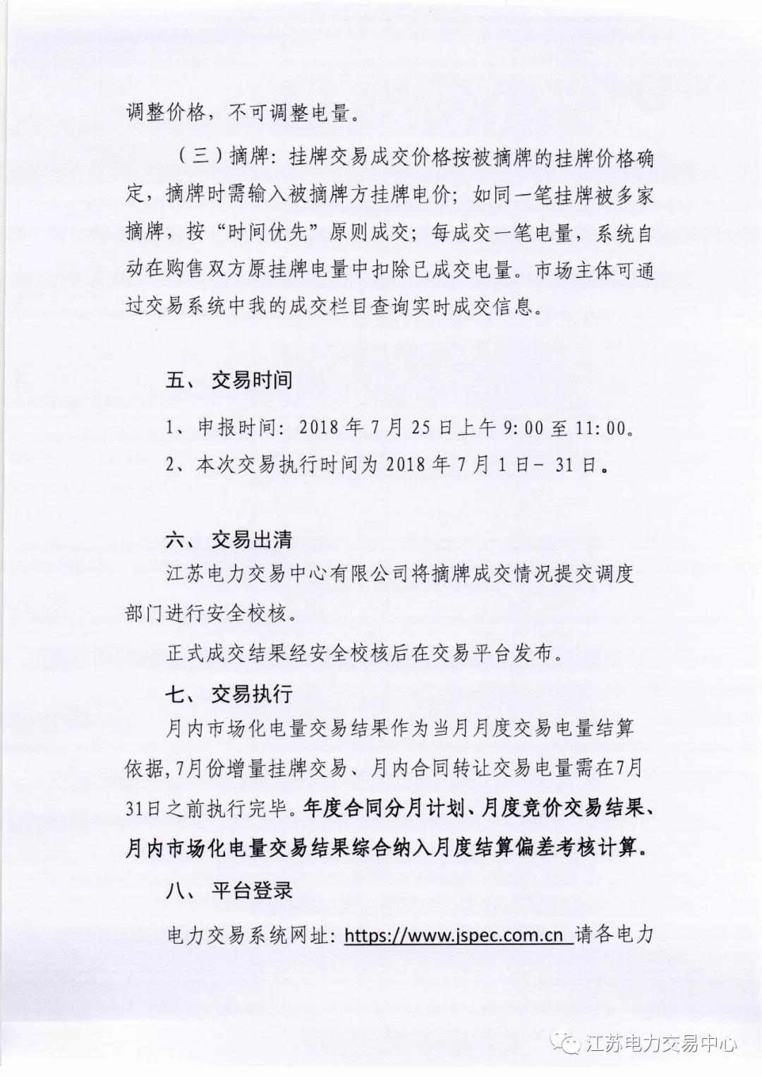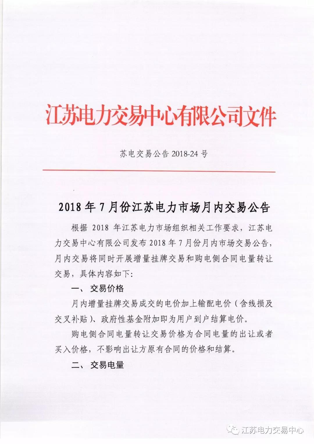 2018年7月份江蘇電力市場月內(nèi)交易公告