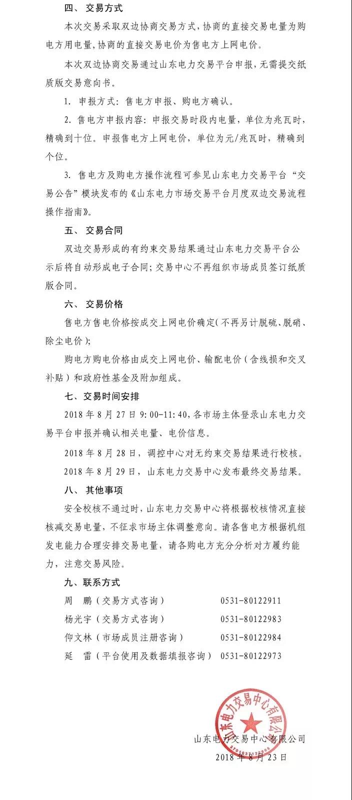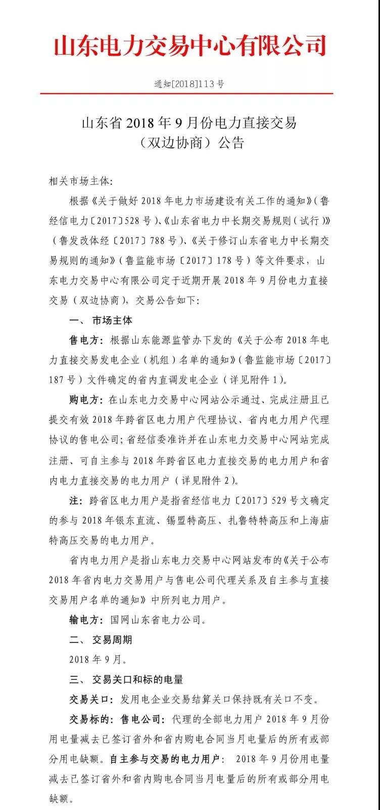 山東省2018年9月份電力直接交易(雙邊協(xié)商)公告