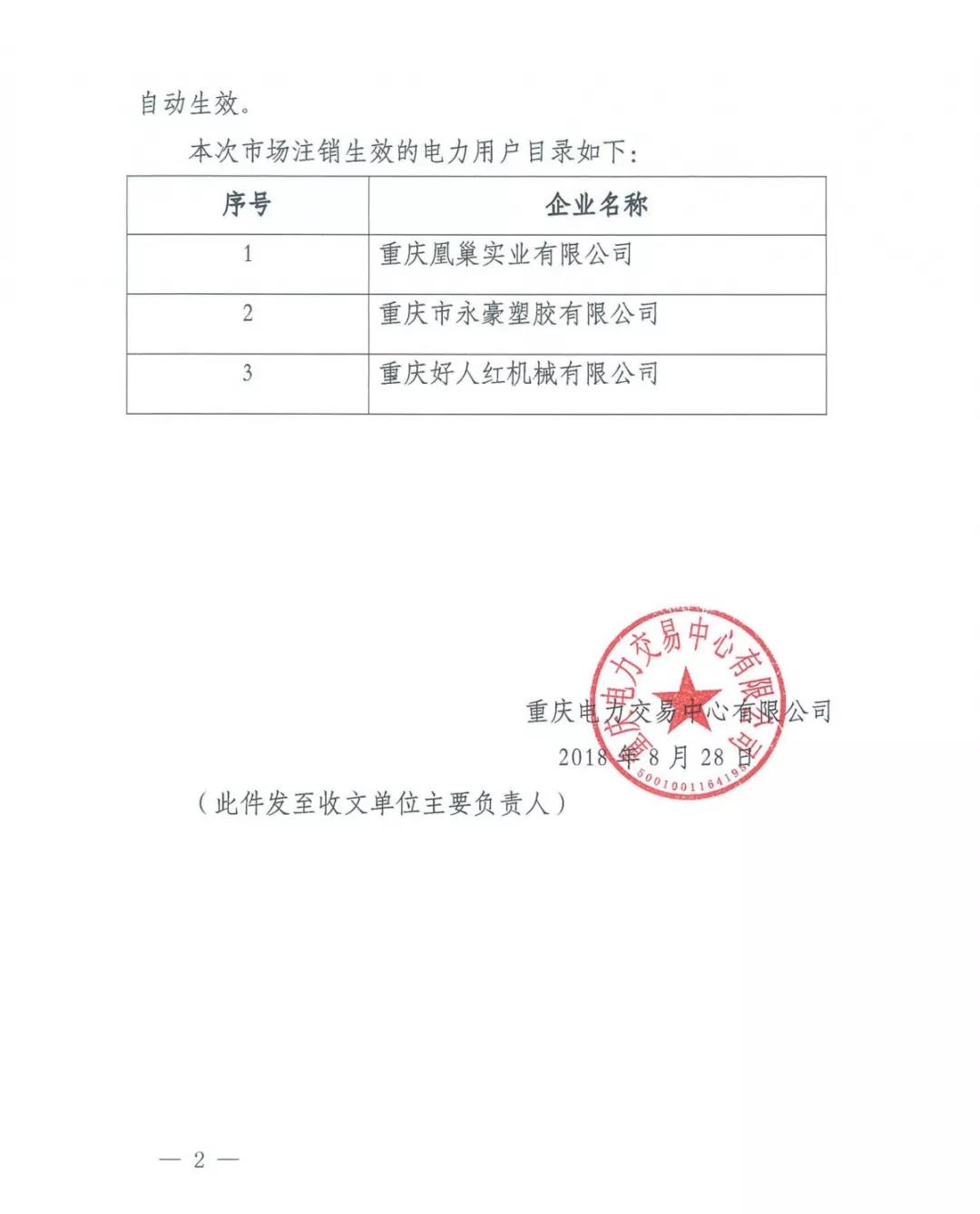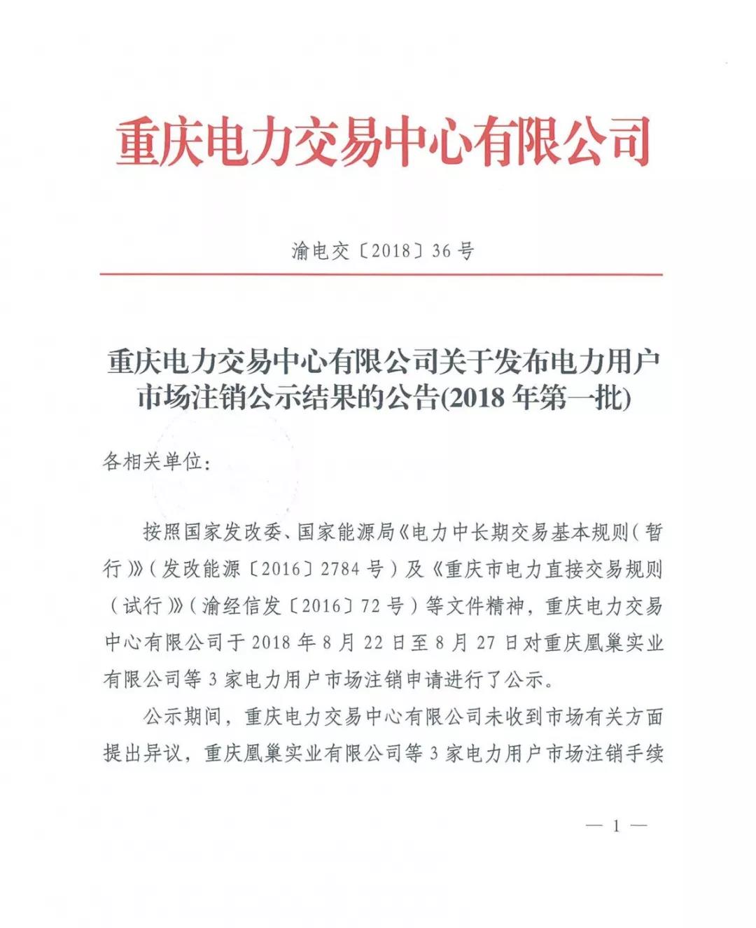 按照國家發(fā)改委、國家能源局《電力中長期交易基本規(guī)則(暫行)》(發(fā)改能源〔2016〕2784號)及《重慶市電力直接交易規(guī)則(試行)》(渝經(jīng)信發(fā)〔2016〕72號)等文件精神,重慶電力交易中心有限公司于2018年8月22日至8月27日對重慶凰巢實(shí)業(yè)有限公司等3家電力用戶市場注銷申請進(jìn)行了公示。