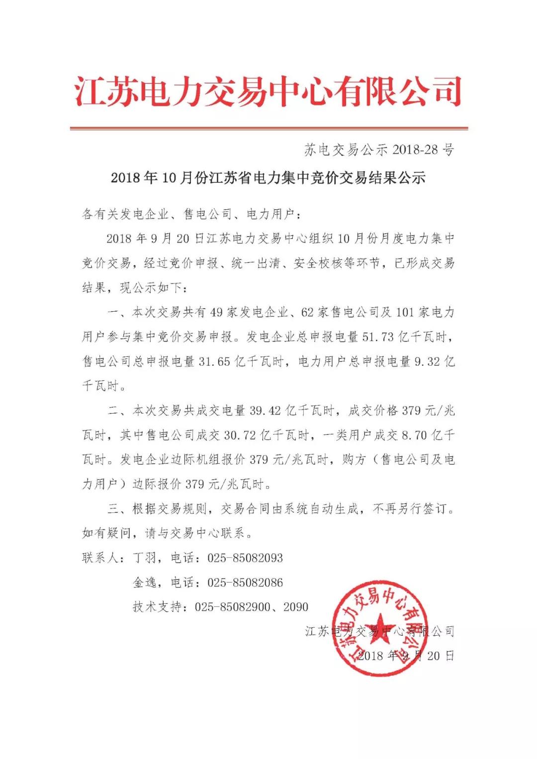 2018年10月份江蘇省電力集中競價(jià)交易結(jié)果公示