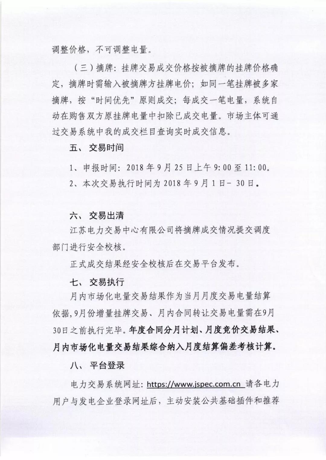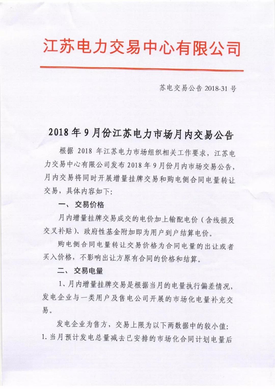 2018年9月份江蘇電力市場月內(nèi)交易公告