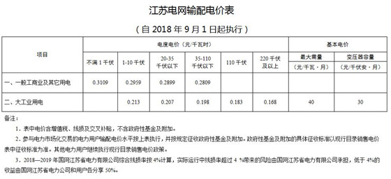 日前,江蘇省物價局發(fā)布《關(guān)于降低一般工商業(yè)電價有關(guān)事項的通知》,通知表示自7月1日起,江蘇省一般工商業(yè)及其它用電類別電價每千瓦時降低2.36分;涉及一般工商業(yè)及其它用電類別的輸配電價每千瓦時降低2.03分。自9月1日起,江蘇省一般工商業(yè)及其它用電類別電價每千瓦時降低1.57分;涉及一般工商業(yè)及其它用電類別的輸配電價每千瓦時降低1.57分。居民生活、農(nóng)業(yè)生產(chǎn)、大工業(yè)用電價格不調(diào)整。