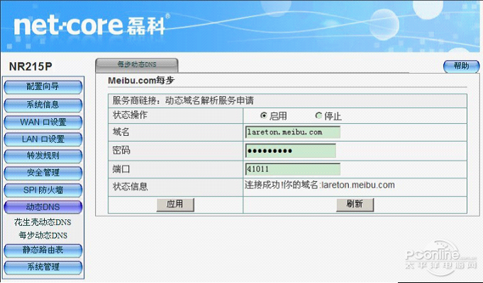 然后下載其客戶端,由于NR215P內(nèi)嵌了每步動(dòng)態(tài)域名服務(wù),所以可以不用下載其客戶端。在NR215P操作界面中動(dòng)態(tài)DDNS(每步動(dòng)態(tài)DDNS)中填入你注冊(cè)的域名: