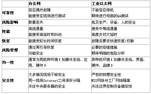 MES系統(tǒng)的防護(hù)相對特殊,既要直接采集來源于生產(chǎn)現(xiàn)場的數(shù)據(jù),同工廠生產(chǎn)車間中的各項終端設(shè)備都會進(jìn)行直接的數(shù)據(jù)交互,而且也要同上層的ERP系統(tǒng)進(jìn)行通訊,因此MES系統(tǒng)在大多數(shù)企業(yè)中,為了方便與ERP系統(tǒng)之間的數(shù)據(jù)交互與員工訪問,通常會劃分在辦公網(wǎng)的安全防護(hù)體系中。但是,實際上由于MES系統(tǒng)能夠直接對工業(yè)控制系統(tǒng)進(jìn)行訪問,因此,對于MES系統(tǒng)的防護(hù)應(yīng)該提升其系統(tǒng)防護(hù)級別,將MES系統(tǒng)與辦公網(wǎng)進(jìn)行隔離。工廠信息安全中最為基礎(chǔ)的部分就是工業(yè)以太網(wǎng),所以工業(yè)以太網(wǎng)網(wǎng)絡(luò)首先得必須保證7*24*365天的可用性,必須能夠不間斷的可操作,能夠確保系統(tǒng)的可訪問性,數(shù)據(jù)能夠?qū)崟r進(jìn)行傳輸,需要有完備的保護(hù)方案。工業(yè)以太網(wǎng)與普通辦公網(wǎng)具體區(qū)別如下表所示: