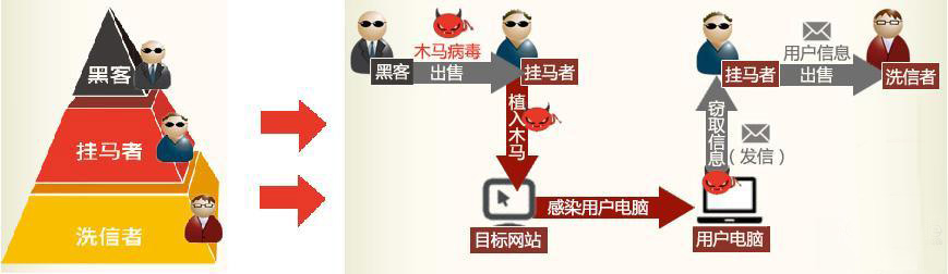 當(dāng)以上三種角色建立并開始運作,一條黑客編制的黑色產(chǎn)業(yè)鏈便形成了。