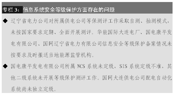 3. 部分電力企業(yè)對信息安全等級保護工作重視不夠,定級、備案、測評、整改等環(huán)節(jié)的各項要求落實不嚴,主要體現(xiàn)在: