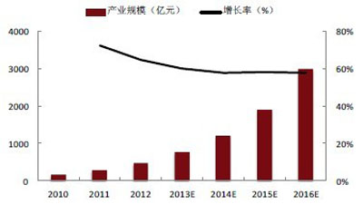 圖1:2010-2016年中國云計算產(chǎn)業(yè)規(guī)模及預(yù)測(億元)