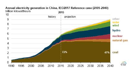 根據(jù)美國(guó)能源信息署(EIA),未來(lái)幾十年,可再生能源在中國(guó)發(fā)電量中的占比將增長(zhǎng),而燃煤發(fā)電的份額將從2015年的72%降至2040年的47%。