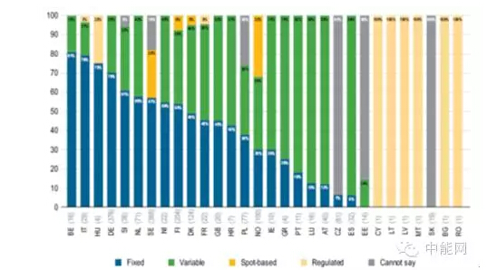 圖6各國代碼后的數(shù)字是交易品種。在已經(jīng)簽署的售電合同中,總體上固定電價品種比例較高,有851個品種,葡萄牙、比利時、意大利、匈牙利和德國首都以固定電價為主;變化電價品種有666個,含基于現(xiàn)貨價格的品種,克羅地亞、愛爾蘭、盧森堡、挪威和西班牙則以價格變化品種為主。