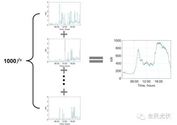 你可以嘗試再用另外1000個家庭的負(fù)荷疊加一次,差別跟上圖不會太大。這種現(xiàn)象就是由用戶用電習(xí)慣的隨機(jī)分布性所造成的。