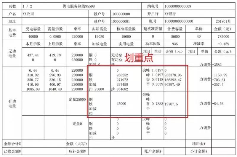 大家可能注意到,在紅框第二行,扣了25000千瓦時,這個電量,就是大家的非生產(chǎn)用電量了,它和峰平谷電量相加,就是當月的總用電量。但是非生產(chǎn)用電的價格和峰平谷價格不一樣,因此單獨列出。