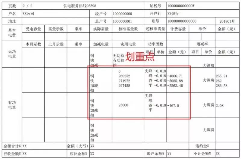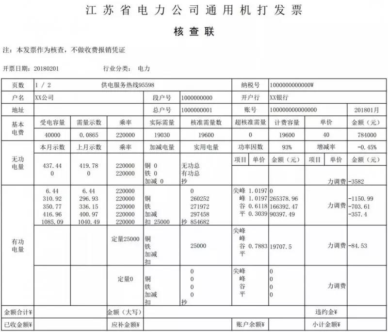 接下來我們翻到第二頁,這時我們發(fā)現(xiàn),第一頁中的峰平谷電量和定量25000千瓦時電量再次出現(xiàn)了,而且對應(yīng)的單價是一個負數(shù)。沒錯,這就是咱們當月的優(yōu)惠電量了。江蘇省2018年電力市場用戶是全電量參與,因此咱們的每一度電都可以享受到優(yōu)惠。這里要注意,有的用戶會出現(xiàn)多行數(shù)據(jù),產(chǎn)生多頁核查聯(lián),但前后數(shù)據(jù)一定是一一對應(yīng)的哦。