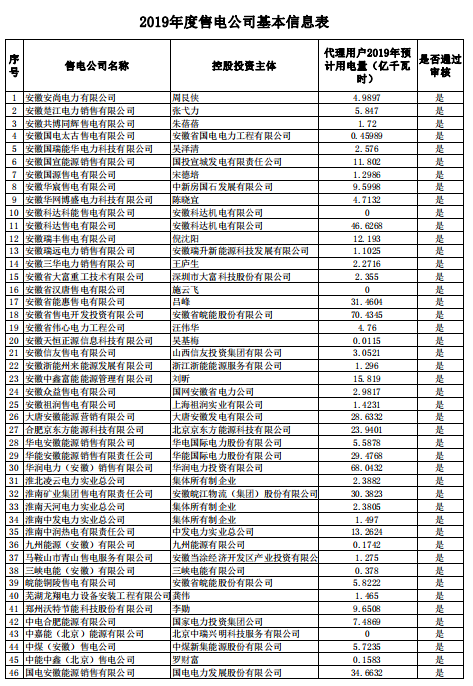 安徽電力交易中心今日發(fā)布了《關于發(fā)布2019年度售電公司基本信息的通知》,含控股投資主體、代理用戶2019年預計用電量(億千瓦時)、是否通過審核等信息。其中,67家售電公司中安徽萬聯(lián)電力有限公司等6家未通過審核。