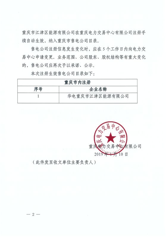重慶電力交易中心日前發(fā)布了《關(guān)于公布售電公司公示結(jié)果的公告(2018年第十二批)》,華電重慶市江津區(qū)能源有限公司在重慶電力交易中心有限公司注冊(cè)手續(xù)自動(dòng)生效,納入重慶市售電公司目錄。