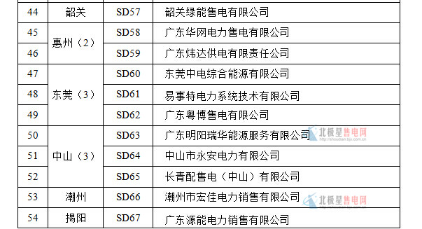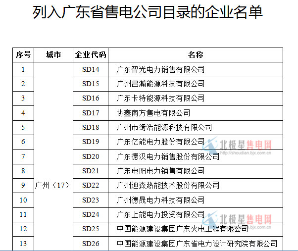 廣東粵電電力銷售有限公司、華能廣東能源銷售有限責任公司、華潤電力(廣東)銷售有限公司、中電投(深圳)電力銷售有限公司、深圳能源售電有限公司、廣州發(fā)展電力銷售有限公司、新奧(廣東)能源銷售有限公司、廣東華廈電力銷售有限公司、肇慶大旺電力熱力有限公司、廣州恒運綜合能源銷售有限公司、深圳深電能售電公司、深圳兆能供電服務公司、廣州穗開電業(yè)有限公司