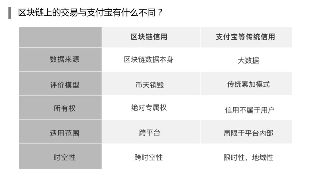 這張表格可以解釋一下區(qū)塊鏈的信用和支付寶等傳統(tǒng)信用的不一樣,剛才說了區(qū)塊鏈的信用是基于區(qū)塊鏈技術(shù)本身不需要大數(shù)據(jù)。