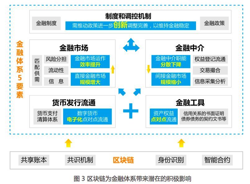 基于區(qū)塊鏈在金融資產(chǎn)權(quán)益證明發(fā)放與流通中的應(yīng)用,區(qū)塊鏈將通過“一升一降三創(chuàng)新”,對(duì)貨幣發(fā)行流通、金融工具、金融市場(chǎng)、金融中介以及制度與調(diào)控機(jī)制等金融體系要素帶來潛在的積極影響。