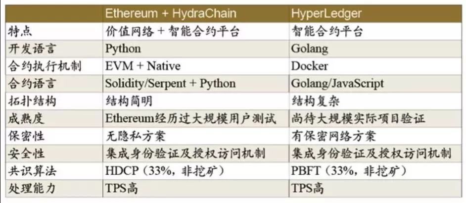 3、采用的技術(shù)實現(xiàn)思路上不一樣。以太坊更多的是靠自己實現(xiàn),自己造輪子,有點開發(fā)人員炫技的感覺,如自己提供合約語言 solidity,自己實現(xiàn)EVM(這個可能是實際需要)。 圖表是筆者曾經(jīng)的一個私鏈項目中對兩者的比較(私鏈考慮了 Hydrachain的可行性)