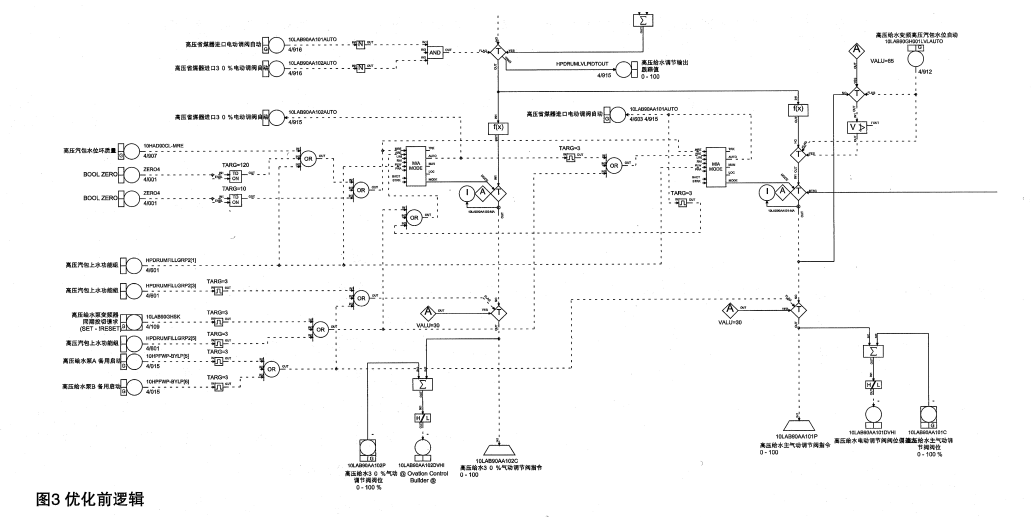 針對以上問題,結(jié)合運行歷史數(shù)據(jù)分析研究,決定決定對高壓汽包水位30%、100%調(diào)門調(diào)節(jié)水位的控制邏輯進行修改:(1)取消30%給水調(diào)門三沖量調(diào)節(jié)功能回路,它只在機組啟、停及低負荷小于30%期間(汽機負荷)進行單沖量調(diào)節(jié)汽包水位,此時100%給水調(diào)門全關(guān);(2)取消100%給水調(diào)門單沖量調(diào)節(jié)功能回路,100%給水調(diào)門只在機組中高負荷下進行三沖量調(diào)節(jié)。邏輯優(yōu)化如圖4。