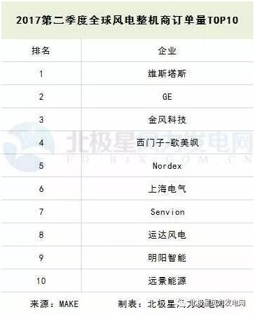 2017年第二季度全球風電整機商訂單量前三名為維斯塔斯、GE、金風科技,入圍全球Top10的中國風電整機商有5家:金風科技(3)、上海電氣(6)、運達風電(8)、明陽智能(9)、遠景能源(10)。上半年全球風電整機商訂單量前三名為維斯塔斯、西門子-歌美颯、GE,入圍全球Top10的中國風電整機商有3家:金風科技(4)、上海電氣(7)、明陽智能(9)。