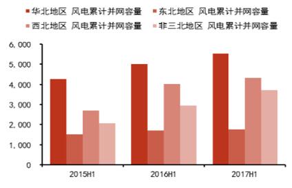 2015H1-2017H1年各地區(qū)風電累計并網(wǎng)容量(萬千瓦)