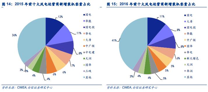 行業(yè)集中度下滑,投資主體多元化。由于風電一般單個項目規(guī)模較大,對資金規(guī)模及融資能力要求較高,國內(nèi)風電開發(fā)主體為以五大發(fā)電集團(國電、華電、華能、大唐、國電投)為主的央企。2016 年,中國風電有新增裝機的開發(fā)商企業(yè)超過 100 家,前十家裝機容量超過 1300 萬千瓦,占比達到 58.8%,累計裝機前十家的開發(fā)企業(yè)裝機容量超過 1 億千瓦,占比達到 69.4%。但隨著風電行業(yè)的快速發(fā)展以及風電運營具備較好的經(jīng)濟性,參與風電投資的企業(yè)越來越多,2016 年前十大開發(fā)企業(yè)市場份額同比下降 6.6%,且在 2016 年新增裝機容量的前十名中,民營企業(yè)數(shù)量從 2015 年的 1 家(天潤)增長至 2 家(天潤、新天綠色)。