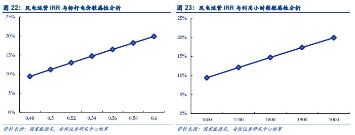 另外,通過敏感性分析,我們發(fā)現(xiàn) IRR 與利用小時數(shù)和標桿上網(wǎng)電價均呈現(xiàn)正相關關系,且利用小時數(shù)提升和標桿電價下調對 IRR 影響均較大。