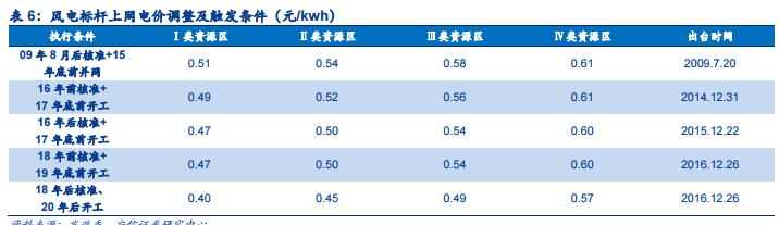 2016 年 12 月底國家發(fā)改委提出下調陸上風電上網(wǎng)電價,2018 年 1 月 1 日之后,一類至四類資源區(qū)新核準建設陸上風電標桿上網(wǎng)電價分別調整為每千瓦時 0.40 元、0.45 元、0.49 元、 0.57 元,較當前上網(wǎng)電價下調幅度分別為 14.89%,10%,9.26%,5%。另外,此次電價下調的觸發(fā)條件由原來的并網(wǎng)變更為核準+兩年內開工。