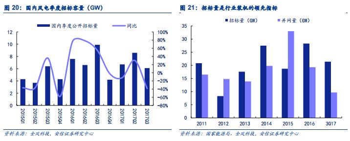 2016 年,全國風電新增公開招標 28.3GW,同比增長 51.34%,招標量創(chuàng)歷史紀錄;2017 年前三季度,全國風電新增公開招標 21.3GW,同比下降 11.7%,招標量維持在高位水平。從歷史數(shù)據(jù)來看,招標通常領先實際并網(wǎng)數(shù)據(jù)一年左右,12/15 年招標下滑對應 13/16 年并網(wǎng)容量下滑,13/14 年招標增長對應 14/15 年并網(wǎng)容量增長。然而,16 年招標大幅上升卻對應 17 年并網(wǎng)容量同比下滑,其中主要原因在于風電開發(fā)建設區(qū)域結構的改變及標桿電價下調觸發(fā)條件的改變。
