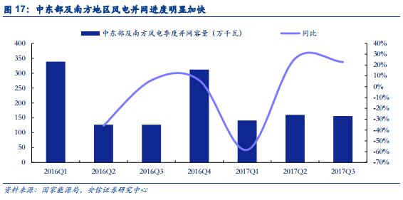 由于行業(yè)沒有施工周期相關的統(tǒng)計數(shù)據(jù),我們很難通過量化角度來分析,但據(jù)我們產業(yè)鏈調研了解到,17 年施工周期拉長除了地形更加復雜、環(huán)評更加嚴格、土地性質變更更加繁瑣等客觀因素外,也有項目施工經(jīng)驗不足的影響。實際上,國內風電開發(fā)建設從 2016 年起就逐步向中東部和南方地區(qū)轉移,經(jīng)過兩年的開工建設,施工經(jīng)驗相比之前也更加成熟。另外,對中東部和南方地區(qū) 2016 年以來的并網(wǎng)數(shù)據(jù)進行統(tǒng)計,我們發(fā)現(xiàn),除 2016Q1 補裝基數(shù)較高導致 2017Q1 并網(wǎng)數(shù)據(jù)大幅下滑,2017 年二季度以來,中東部和南方地區(qū)的風電并網(wǎng)穩(wěn)步向上,進度明顯加快,其實,這也從另外一個角度驗證了我們對施工周期影響弱化的判斷。隨著施工周期影響的弱化,我們預計中東部和南方地區(qū)將迎來快速增長。