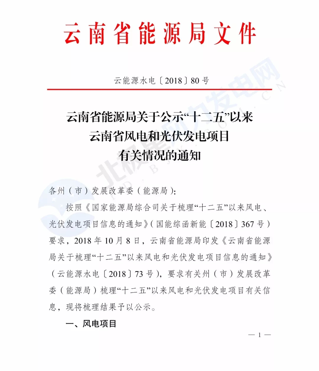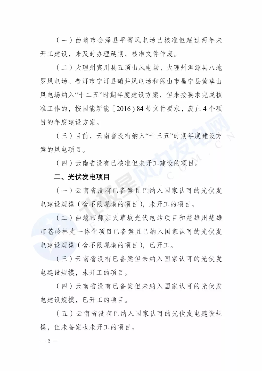 據(jù)《云南省能源局關(guān)于公示“十二五”以來 云南省風(fēng)電和光伏發(fā)電項目 有關(guān)情況的通知》,曲靖市會澤縣平箐風(fēng)電場(48MW)已核準(zhǔn)但超過兩年未開工建設(shè),未及時辦理延期,核準(zhǔn)文件作廢。 大理州賓川縣五頂山風(fēng)電場(49.5)、大理州洱源縣八地 羅風(fēng)電場(49.5)、普洱市寧洱縣硝井風(fēng)電場(50)和保山市昌寧縣黃草山風(fēng)電場(50)納入“十二五”時期年度建設(shè)方案,但未按要求完成核 準(zhǔn)工作的,按國能新能〔2016 ) 84 號文件要求,廢止 4個項目的年度建設(shè)方案。
