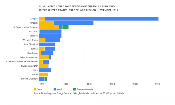 ▲ 截至 2016 年 11 月為止,Google 在歐、美及墨西哥自投入綠電購買以來,累積購買的綠電量(MW)排名第一,其中以風(fēng)力占最大宗。(Source:Bloomberg)