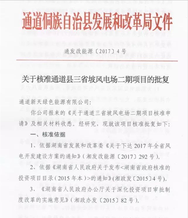 2017年7月13日,通道三省坡風(fēng)電場(chǎng)二期48MW工程順利獲得通道縣發(fā)改局核準(zhǔn)。
