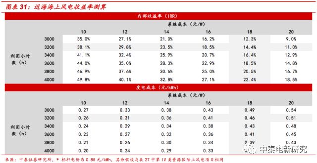 海上風(fēng)電利用小時(shí)數(shù)長(zhǎng)、靠近負(fù)荷中心,收益率具有優(yōu)勢(shì)。東南海上風(fēng)電項(xiàng)目靠近用電負(fù)荷中心,不存在限電,同時(shí)利用小時(shí)數(shù)長(zhǎng),因此整體收益率較高。我們測(cè)算,當(dāng)海上風(fēng)電系統(tǒng)成本為18元/W、利用小時(shí)數(shù)3200,近海海上風(fēng)電的度電成本為0.46元/kWh,收益率為14.4%。