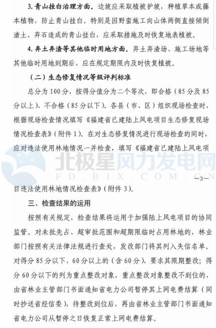 北極星風力發(fā)電網(wǎng)小編從通知中發(fā)現(xiàn),專項檢查重點針對項目道路建設、風機周邊防護、青山掛白治理、棄土棄渣等臨時用地植被恢復情況,并且對生態(tài)修復等級評判分為合格、不合格二個等次。針對專項檢查結果,對違法違規(guī)使用林地的風電企業(yè),林業(yè)部門將按有關法律法規(guī)查處,發(fā)改部門將其列入失信名單。對生態(tài)修復工作不達標、效果差的,要求限期整改,對整改仍不到位的,暫停其上網(wǎng)電費結算。