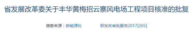 報來《關(guān)于申請豐華黃梅招云寨風(fēng)電場項目核準(zhǔn)的請示》(招云寨風(fēng)電〔2017〕6號)及有關(guān)材料收悉。經(jīng)研究,現(xiàn)就該項目核準(zhǔn)事項批復(fù)如下: