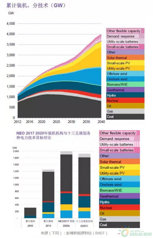 BNEF預計“十三五”期間中國未來裝機結(jié)構(gòu)會不斷轉(zhuǎn)型,2020年超額完成規(guī)劃的裝機總量,主要貢獻來自于光伏和風電,但是煤電去產(chǎn)能預計差強人意。到2040年中國可實現(xiàn)大部分裝機都來自清潔能源,清潔能源中大部分裝機來自陸上風電和光伏。