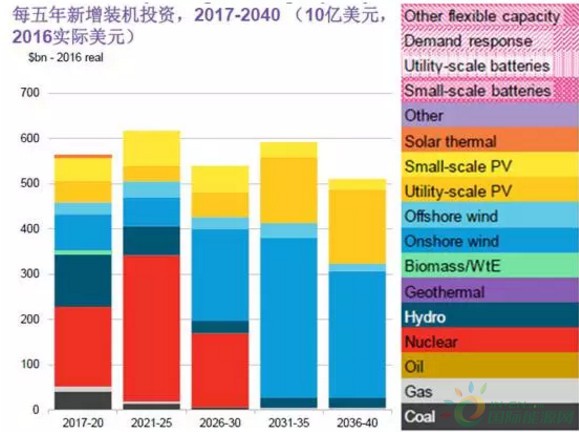 2021-25:陸上風電和大型光伏的平均投資額比2017-20年有所降低。原因是BNEF假設從2020年開始原有的光伏風電發(fā)電補貼將不再繼續(xù),伴隨著產(chǎn)能過剩,在光伏和風電的成本還沒有低于運營中火電成本時,它們將會“沉淪”一陣子,直到2025年后投資大幅上升。