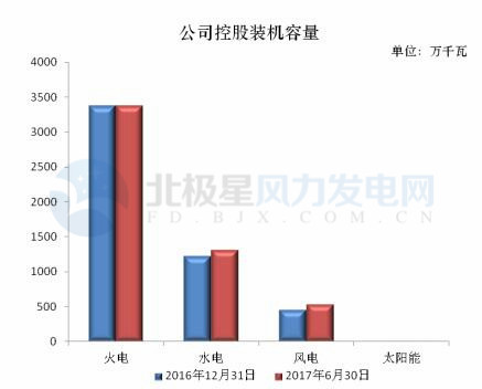 截至 2017 年 6 月 30 日,國(guó)電電力控股裝機(jī)容量 5245.94 萬(wàn)千瓦,其中火電3374.75 萬(wàn)千瓦,風(fēng)電 535.31 萬(wàn)千瓦,太陽(yáng)能光伏 21.20 萬(wàn)千瓦。 2017 年上半年,新增發(fā)電裝機(jī)容量 157.79 萬(wàn)千瓦。其中風(fēng)電新增裝機(jī) 72.79 萬(wàn)千瓦,分別是新疆新能源三塘湖二期 4.95 萬(wàn)千瓦、山西新能源寶塔山 4.8 萬(wàn)千瓦、云南新能源昆明風(fēng)擺山 3 萬(wàn)千瓦、河北新能源五福堂 15 萬(wàn)千瓦、新疆景峽 40.05 萬(wàn)千瓦、湖南新能源風(fēng)雨殿(二期)寨子背 4.99 萬(wàn)千瓦。