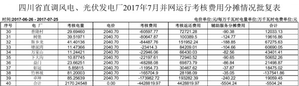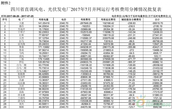 三、請(qǐng)你公司根據(jù)我辦《關(guān)于印發(fā)<四川風(fēng)電場(chǎng)及光伏電站并網(wǎng)運(yùn)行管理實(shí)施細(xì)則(試行)>的通知》的有關(guān)規(guī)定,按照《四川省直調(diào)風(fēng)電、光伏發(fā)電廠 2017 年 7 月并網(wǎng)運(yùn)行考核費(fèi)用批復(fù)表》(附件1-2),在發(fā)電企業(yè) 2017 年8 月份的電費(fèi)中一并結(jié)算。