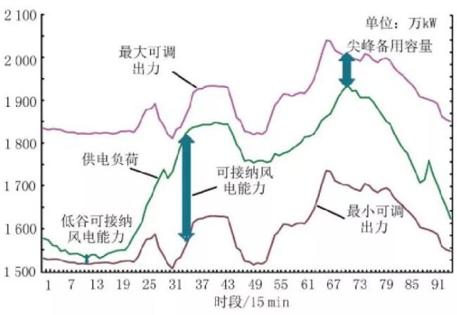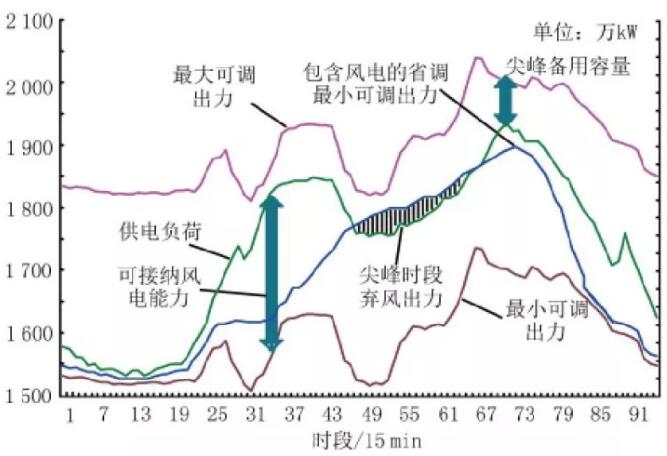 圖1為遼寧電網(wǎng)風(fēng)電消納原理圖,紅色曲線為最大可調(diào)出力曲線,褐色曲線為最小可調(diào)出力曲線,綠色曲線為負(fù)荷曲線。最大可調(diào)出力曲線為各時段省調(diào)直調(diào)的常規(guī)機(jī)組計劃最大出力、聯(lián)絡(luò)線受入功率、地方電廠最大上網(wǎng)功率及旋轉(zhuǎn)備用功率加和;最小可調(diào)出力曲線為各時段省調(diào)直調(diào)的常規(guī)機(jī)組最小出力、聯(lián)絡(luò)線受入功率及地方電廠最小上網(wǎng)功率加和。圖中尖峰最大電力為1950萬kW,低谷最小電力為1540萬kW,峰谷差為410萬kW。