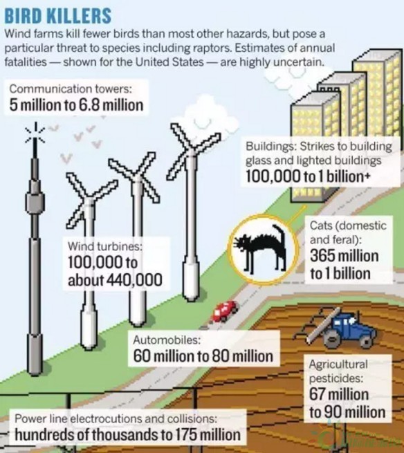 據(jù)美國漁業(yè)與野生動物協(xié)會統(tǒng)計,在美國平均每年有10萬到44萬只鳥類因撞到風機而死亡,看起來是個不小的數(shù)字,但是如果和其他的死亡數(shù)字來比較: