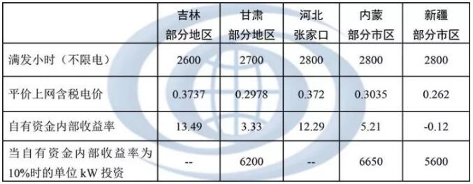 由上表測算可以看出,2018年電價(jià)調(diào)整后,部分風(fēng)電場已經(jīng)很難滿足自有資金內(nèi)部收益10%的要求,近幾年內(nèi)更無法滿足平價(jià)上網(wǎng)條件。若要實(shí)現(xiàn)平價(jià)上網(wǎng),以下對(duì)一些投資少、資源好的地區(qū)在不限電情況下進(jìn)行平價(jià)上網(wǎng)分析,包括吉林、甘肅、張家口、內(nèi)蒙、新疆。