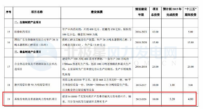 廣東陽(yáng)江市人民政府印發(fā)《陽(yáng)江市戰(zhàn)略新興產(chǎn)業(yè)“十三五”規(guī)劃》。規(guī)劃指出,“十三五”期間,規(guī)劃建設(shè)陸上風(fēng)電裝機(jī)容量22萬(wàn)千瓦,海上風(fēng)電裝機(jī)容量156萬(wàn)千瓦。建設(shè)一個(gè)大型海上風(fēng)機(jī)制造基地,主要生產(chǎn)產(chǎn)品有6.5兆瓦海上風(fēng)機(jī)設(shè)備及相關(guān)鋼結(jié)構(gòu)塔筒、風(fēng)機(jī)基礎(chǔ)制造配套設(shè)備以及建設(shè)海上綜合運(yùn)維基地,為粵西沿海海上風(fēng)電設(shè)備提供運(yùn)行維護(hù)服務(wù)。同時(shí)公布了陽(yáng)江市戰(zhàn)略性新興產(chǎn)業(yè)規(guī)劃重大項(xiàng)目表,總計(jì)23個(gè)項(xiàng)目,其中風(fēng)電項(xiàng)目9個(gè)。以下為項(xiàng)目表及規(guī)劃原文: