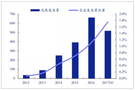 我國光伏發(fā)電發(fā)展起步較晚,從 2013 年開始年度新增裝機容量突破 1000 萬千瓦,2016年我國光伏新增裝機量又創(chuàng)新高,達到 3454 萬千瓦,2017 年上半年,由于 630 搶裝,光伏新 增裝機 2440 萬千瓦,同比增長 9%。光伏發(fā)電量在我國總發(fā)電量中占比較小,2017 年上半 年,全國總發(fā)電量 29508 億千瓦時,而光伏發(fā)電量只有 518 億千瓦時,占總發(fā)電量的 1.76%。 隨著我國光伏行業(yè)的進一步發(fā)展,預(yù)計未來幾年,光伏行業(yè)市場容量將呈現(xiàn)出逐年增長態(tài)勢。